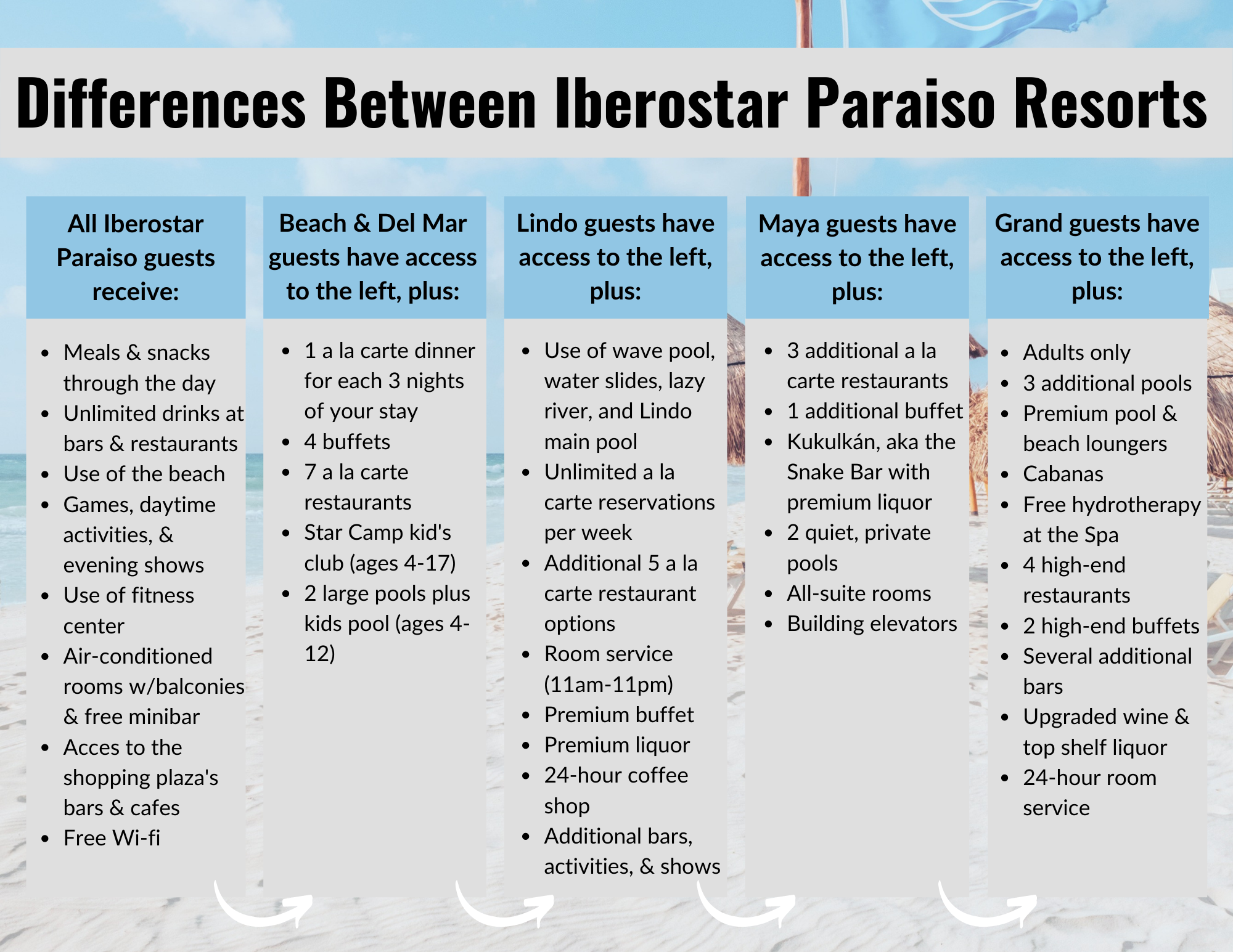As a reminder, the Iberostar Paraiso complex works on a tiered system. Take a look at this graphic below: